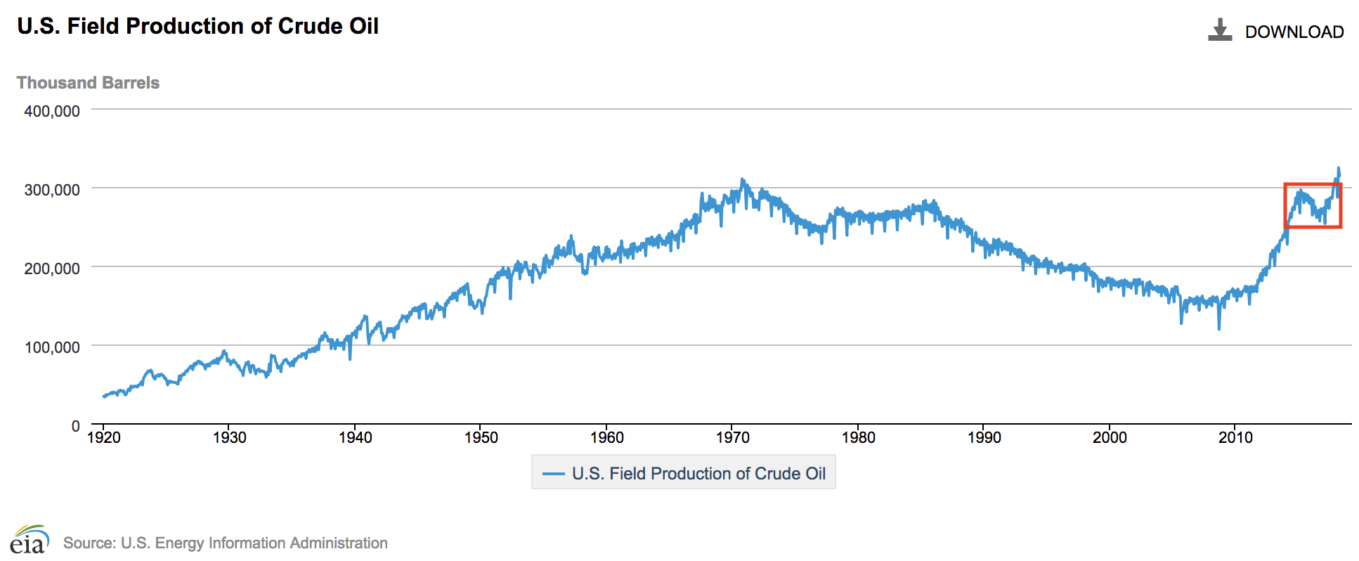 In 2015 as U.S. oil production started to decline in response to lower oil prices, more investors began questioning the ability of MLPs to keep up their steady growth of cash distribution payouts, which has been a key input in valuing MLPs. The following chart shows U.S. oil production dating back to 1920. You can see the production dip in 2010 (outlined in red), but fortunately conditions have since improved.