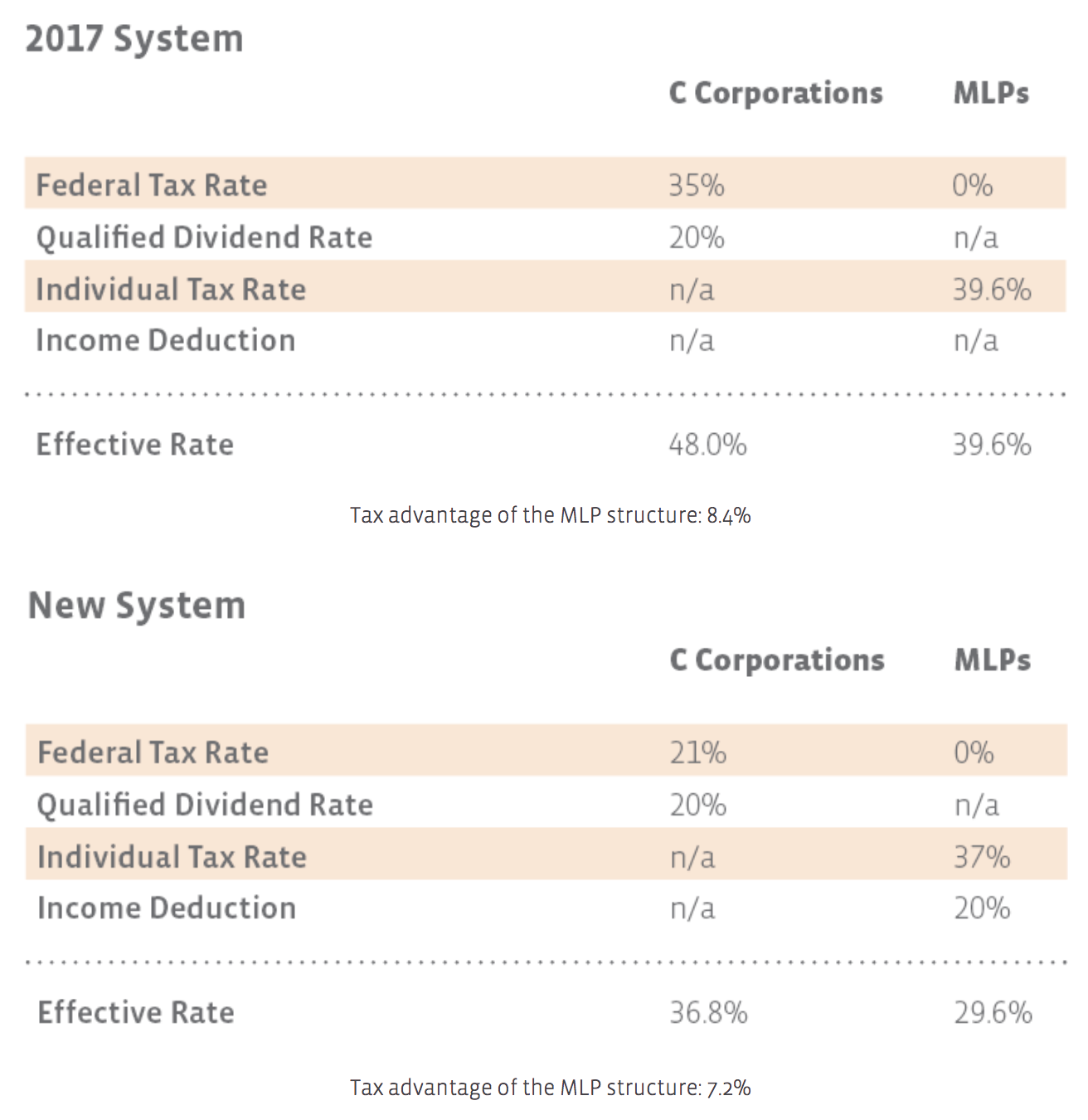 As pass-through entities, MLPs do not pay any federal taxes. In other words, they were essentially getting a double benefit on taxes, which is now being taken away.