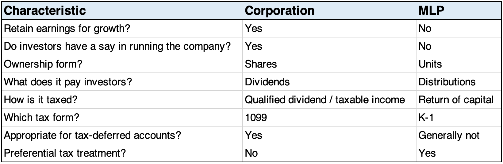 Due to the way MLPs are structured, these entities usually don't pay corporate taxes. MLPs avoid the standard double taxation problem that regular C-corps have, in which the company pays tax on its net income that funds the dividend, and then investors have to pay their own tax on that dividend.