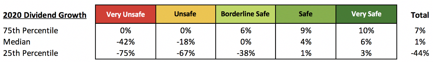 Very Unsafe-rated stocks delivered median dividend growth of -42% last year versus -18% across all Unsafe stocks, 0% for our Borderline Safe bucket, and 4% for Safe stocks.