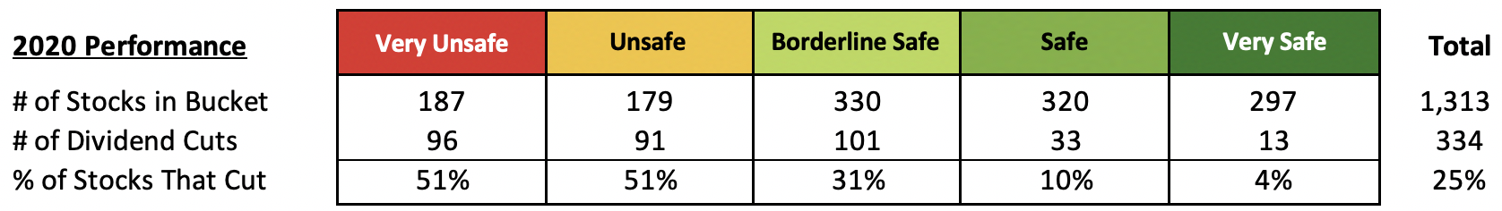 While 51% of stocks with Very Unsafe and Unsafe ratings at the start of the year went on to cut their dividends, only 10% and 4% of Safe and Very Safe-rated companies cut, respectively.