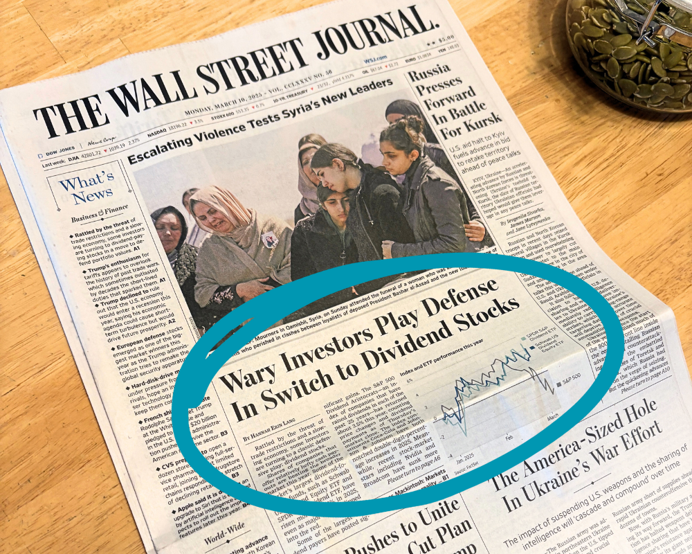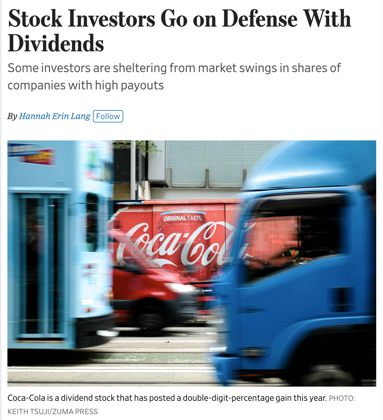 I was honored when The Wall Street Journal reached out to us for our thoughts on this shift. Their article was featured on the front page on Monday. You can find the digital version here: Stock Investors Go on Defense With Dividends.